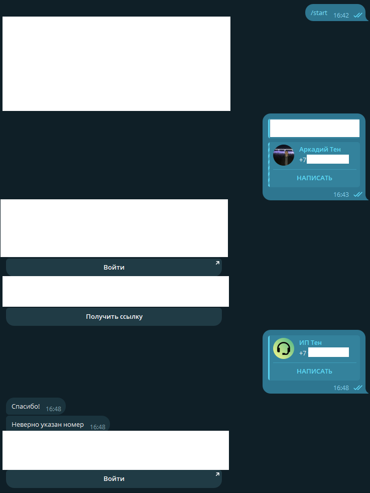 Механика работы выглядела так: пользователь отправлял команду /start, а бот в ответ запрашивал номер телефона через специальную кнопку «Поделиться контактом». При нажатии открывался список контактов, из которого можно было отправить как собственный профиль, так и сохраненный контакт другого пользователя. В результате бот получал не только номер телефона, но и user_id владельца этого номера. Дальше он сверял id отправителя с id из контакта и, если все сходилось, бот формировал ссылку для авторизации, пользователь по ней переходил и успешно попадал в систему.