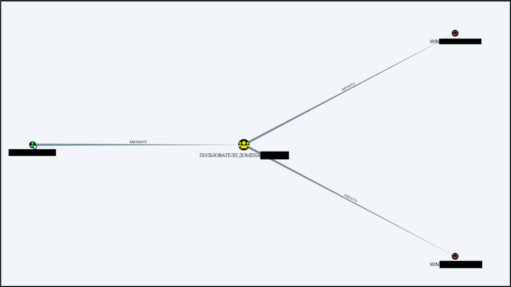 В результате использования учётных данных, найденных на начальном этапе, была реализована классическая цепочка компрометации. Утечка паролей создала точку входа. Наличие права AdminTo у этой учётной записи открыло путь к получению локальных прав администратора на ряде хостов.