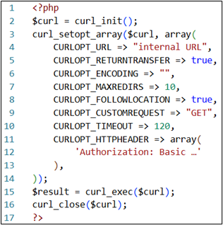 В ходе анализа файловой системы веб-сервера был обнаружен архив с резервной копией исходного кода одного из приложений. После распаковки и изучения содержимого проекта удалось выявить фрагмент PHP-кода, в котором задавались параметры HTTP-запроса к внутреннему сервису. Пароль учётной записи ivanov.i оказался «зашит» прямо в заголовке Authorization HTTP-запроса. Для удобства разработчик напрямую указал свои учётные данные в коде, и, как оказалось позже, эти данные являлись также доменными.