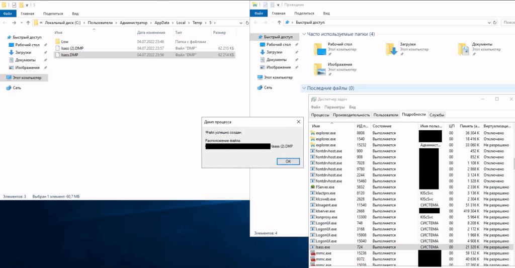 Несмотря на наличие СЗИ на рабочей станции, нам удалось его «обойти» самым примитивным способом — дамп памяти процесса был успешно получен через «Диспетчер задач»: