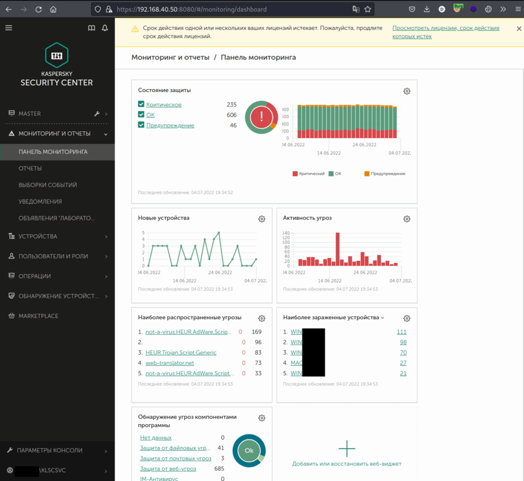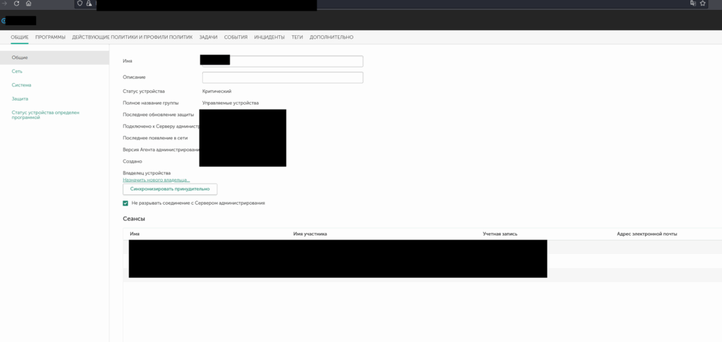 Эти учётные данные позволили получить доступ к административной консоли Kaspersky Security Center, что дало возможность просматривать все управляемые устройства, создавать и распространять задания на выполнение произвольных команд, а также вносить изменения в антивирусные политики:
